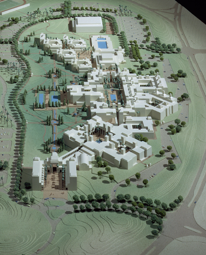 Based on our experience with the design of the Aga Khan University in Karachi, Koc University of Istanbul, and an in-depth study of the architecture of the Middle East, we conceived the design of the entire AUC campus as the architecture of continuous interior spaces that surrounds the observer rather than the architecture of isolated buildings that stand apart from him. In this kind of architecture, voids become more important than buildings and the design will become based on the sequence of open spaces and courtyards each designed for different functions of movement, introspection, interaction, and spiritual rejuvenation. As these spaces unfold in a rhythmic and heirarchical before the eye of the pedestrian, they impart a delightful sense of surprise. They acquire their meaning through the movement of the user in these spaces. Architecture acquires a kinetic quality.